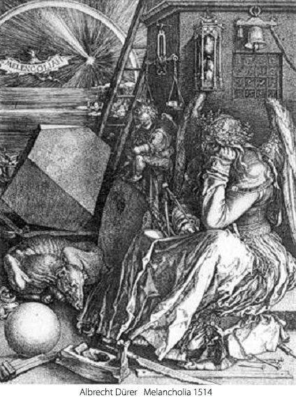 これは、気分が沈みこむこと、憂うつで、悲しく、希望のない、落ち込んだ状態です。「わけもないのに涙が止まらない」と表現される患者さんもいます。患者さんの訴えはもちろんのこと、その表情、外見からも気分が沈みこんでいる様子はわかります。図1のデューラーの銅版画はそのような様子をよく表しています。しかし、身体症状(全身倦怠感、肩こり、食欲不振など)を強く訴える患者さんでは、抑うつ気分があまり本人の訴えとして強く出てこないため、本人も医師も身体疾患と間違えやすいことがあります。これを、身体症状で抑うつ気分がmask(隠す)されるため、仮面(masked)うつ病ということがありますが、今日ではあまり使われない言葉になっています。